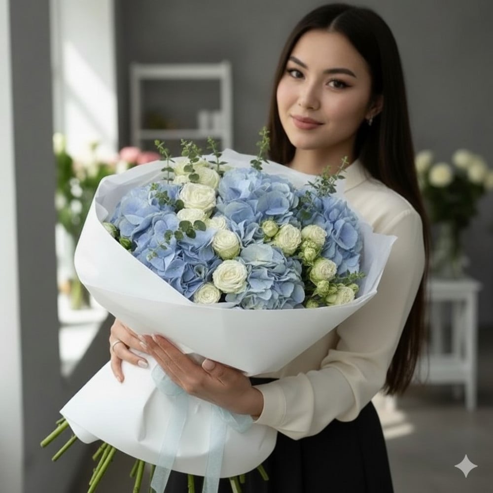Букет из голубых гортензий итбелых роз